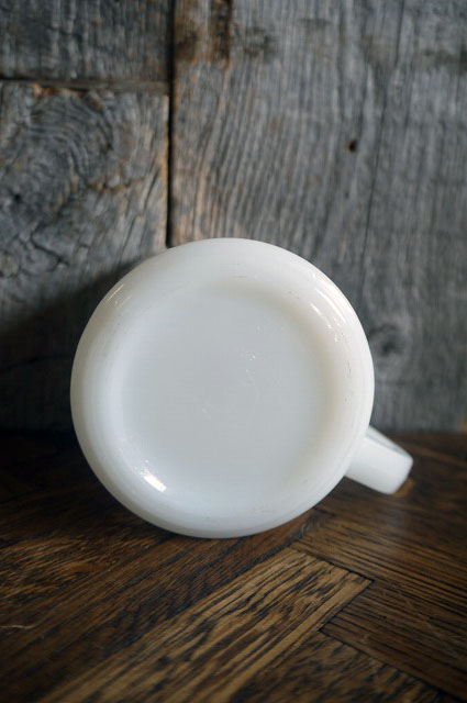 アメリカで買い付けましたビンテージのUSAマグカップです。ミルクガラスにアメリカンなロゴデザインがとても雰囲気があります。厚みのあるミルクガラス素材で、底面にFの表記がありますのでフェデラル社製で、年代の表記はありませんが1970年代頃になるかと思います。状態ですが使用感や目立つダメージはなくディスプレイには問題の無い状態です。ただあくまでビンテージですのでご理解いただける方の購入をよろしくお願いします。