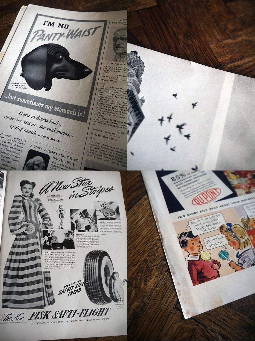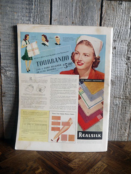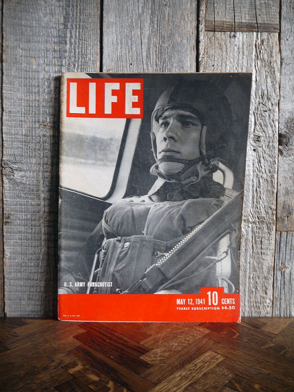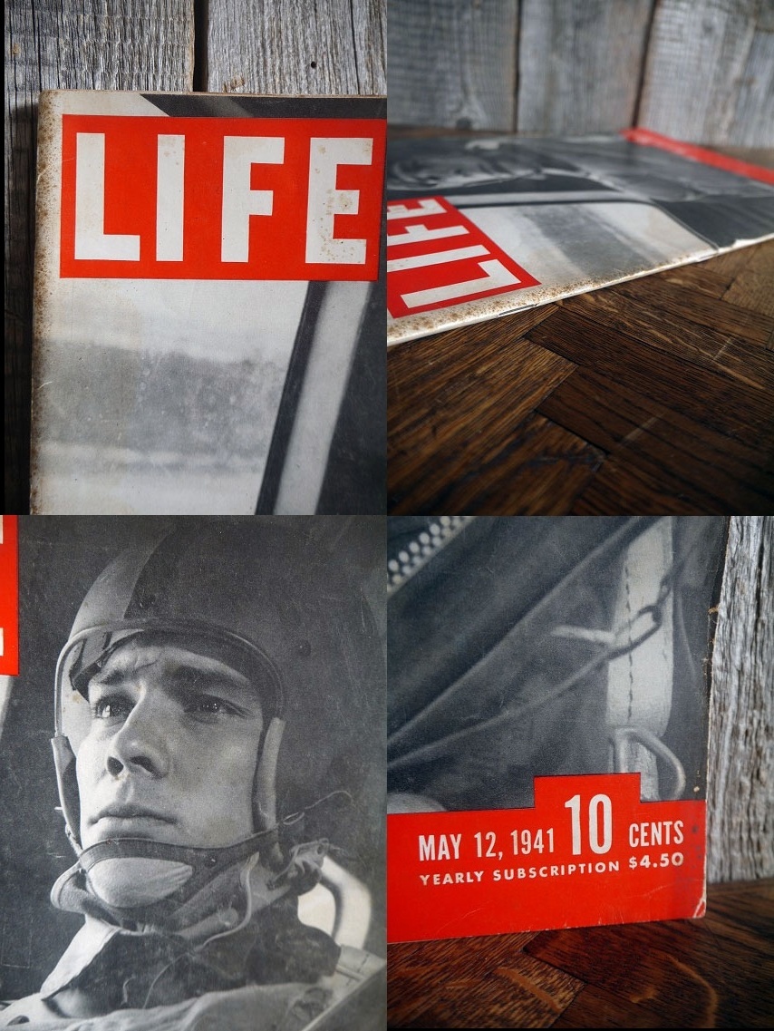 アメリカで買い付けましたビンテージのマガジンです。1941年5月12日に出版されたアメリカの雑誌『LIFE』で、当時の資料やお部屋やお店などのディスプレイとしてもおすすめです。全122ページでお気に入りのページを切り抜いて額装して飾って頂いても良いかと思います。状態は、色焼け、汚れ、細かい破れ、折りたたみシワやページ破れ、多少のシミ汚れなどはありますが、ページ抜けはなく、ディスプレイには問題ない状態です。ただあくまでビンテージのためご理解いただける方のご購入をお願いします。