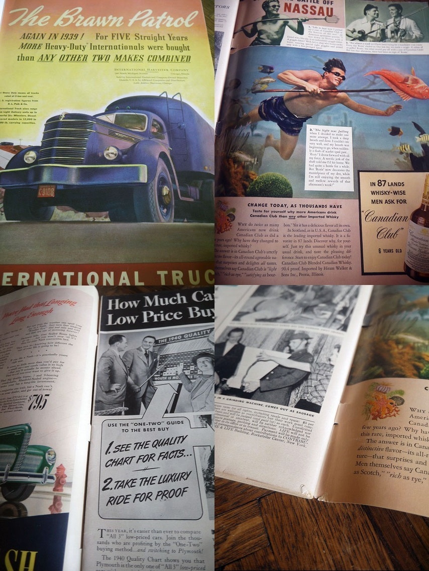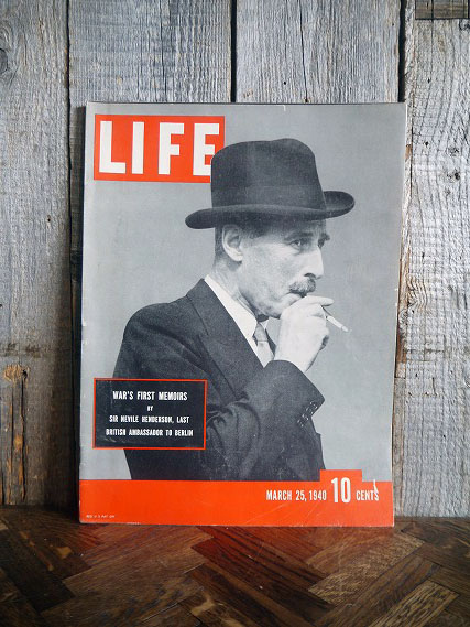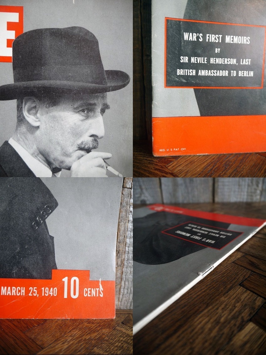 アメリカで買い付けましたビンテージのマガジンです。1940年3月25日に出版されたアメリカの雑誌『LIFE』で、当時の資料やお部屋やお店などのディスプレイとしてもおすすめです。全108ページでお気に入りのページを切り抜いて額装して飾って頂いても良いかと思います。状態は、色焼け、汚れ、細かい破れ、折りたたみシワやページ破れ、多少のシミ汚れなどはありますが、ページ抜けはなく、ディスプレイには問題ない状態です。ただあくまでビンテージのためご理解いただける方のご購入をお願いします。