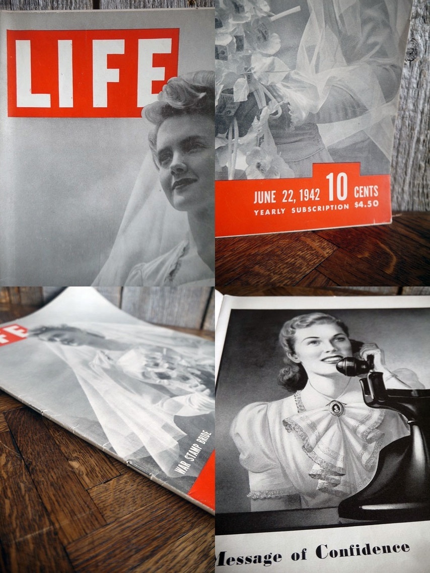 アメリカで買い付けましたビンテージのマガジンです。1942年11月23日に出版されたアメリカの雑誌『LIFE』で、当時の資料やお部屋やお店などのディスプレイとしてもおすすめです。全155ページでお気に入りのページを切り抜いて額装して飾って頂いても良いかと思います。状態は、色焼け、汚れ、細かい破れ、折りたたみシワやページ破れ、多少のシミ汚れなどはありますが、ページ抜けはなく、ディスプレイには問題ない状態です。ただあくまでビンテージのためご理解いただける方のご購入をお願いします。
