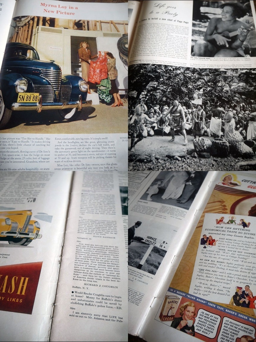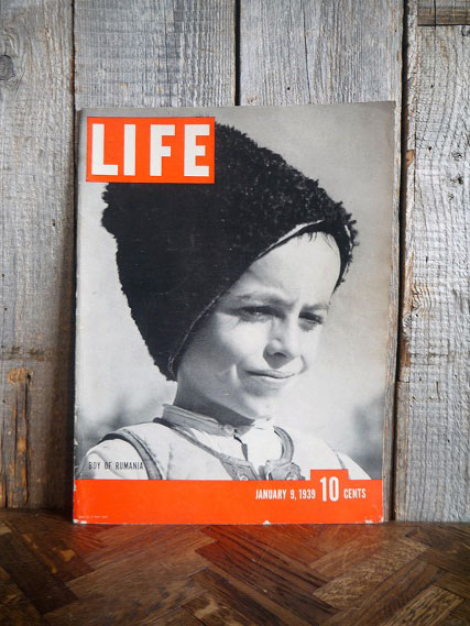 アメリカで買い付けましたビンテージのマガジンです。1939年1月9日に出版されたアメリカの雑誌『LIFE』で、当時の資料やお部屋やお店などのディスプレイとしてもおすすめです。全69ページでお気に入りのページを切り抜いて額装して飾って頂いても良いかと思います。状態は、色焼け、汚れ、細かい破れ、折りたたみシワやページ破れ、多少のシミ汚れなどはありますが、ページ抜けはなく、ディスプレイには問題ない状態です。ただあくまでビンテージのためご理解いただける方のご購入をお願いします。