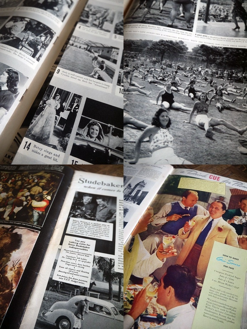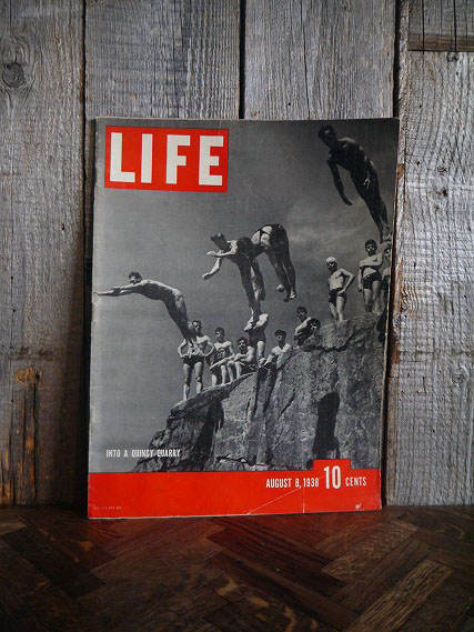 アメリカで買い付けましたビンテージのマガジンです。1938年8月8日に出版されたアメリカの雑誌『LIFE』で、当時の資料やお部屋やお店などのディスプレイとしてもおすすめです。全68ページでお気に入りのページを切り抜いて額装して飾って頂いても良いかと思います。状態は、色焼け、汚れ、細かい破れ、折りたたみシワやページ破れや外れ、多少のシミ汚れなどはありますが、ページ抜けはなく、ディスプレイには問題ない状態です。ただあくまでビンテージのためご理解いただける方のご購入をお願いします。