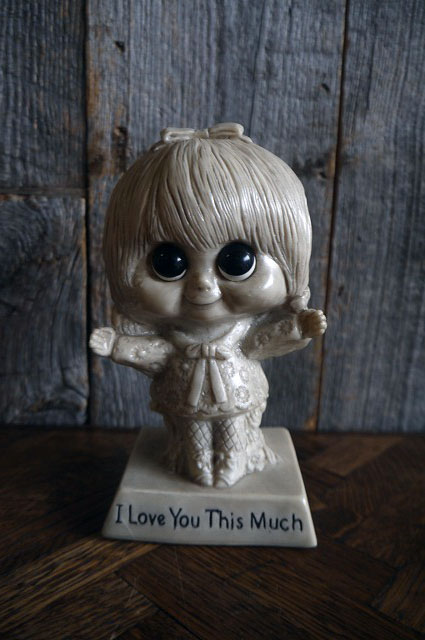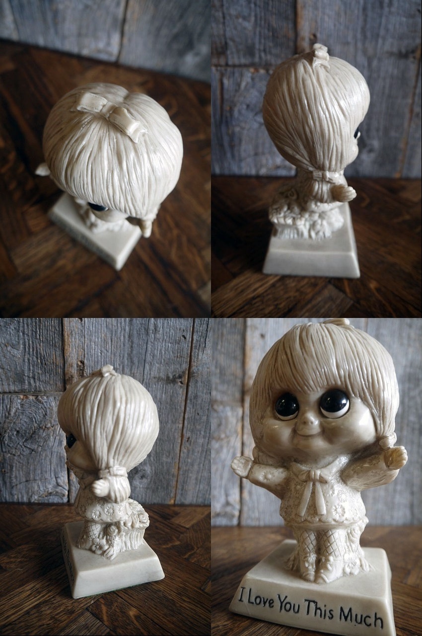 アメリカで買い付けましたビンテージのI Love You This Muchメッセージドールです。目がクリっとした可愛らしい女の子のデザインでとても雰囲気があります。お部屋のディスプレイとして大変オススメです。土台底面のシールから1970年代のW&R BERRIES社製になるかと思います。状態ですが、画像の様に汚れ、小傷、擦れ、底面フェルトにダメ―ジ等はございますがディスプレイには問題ない状態で良いです。あくまでビンテージになりますのでご理解いただける方のご購入をお願いします。