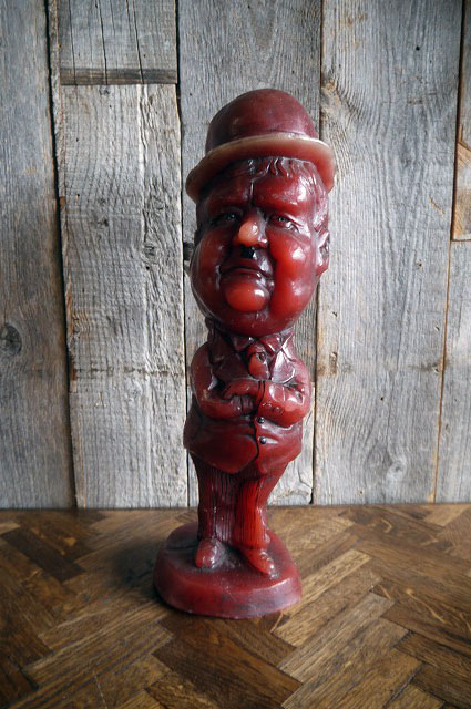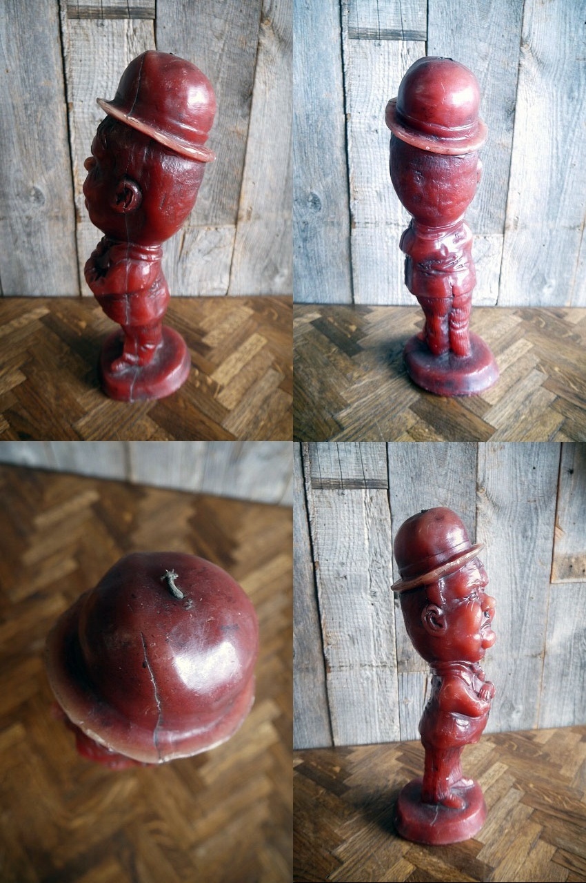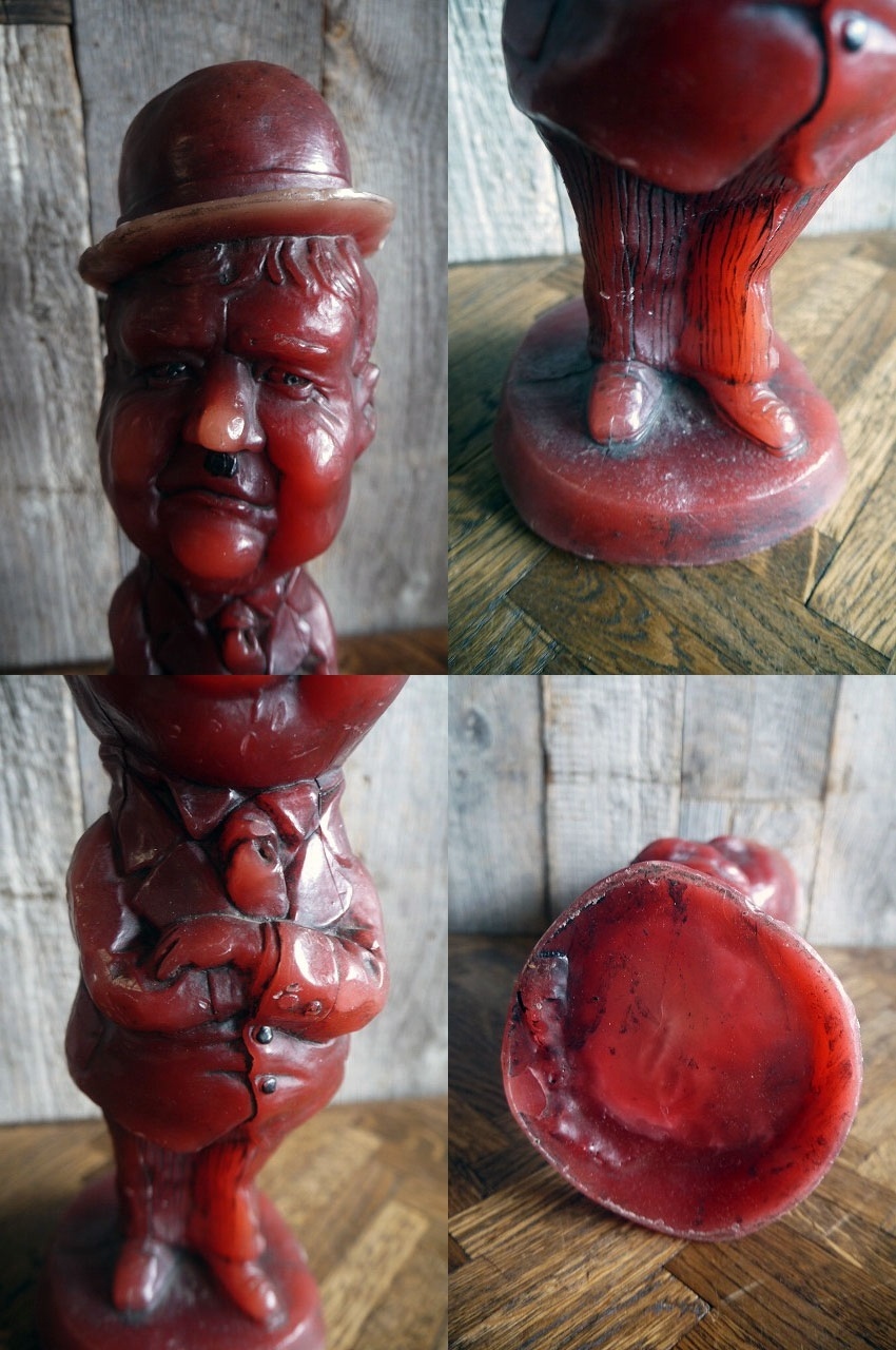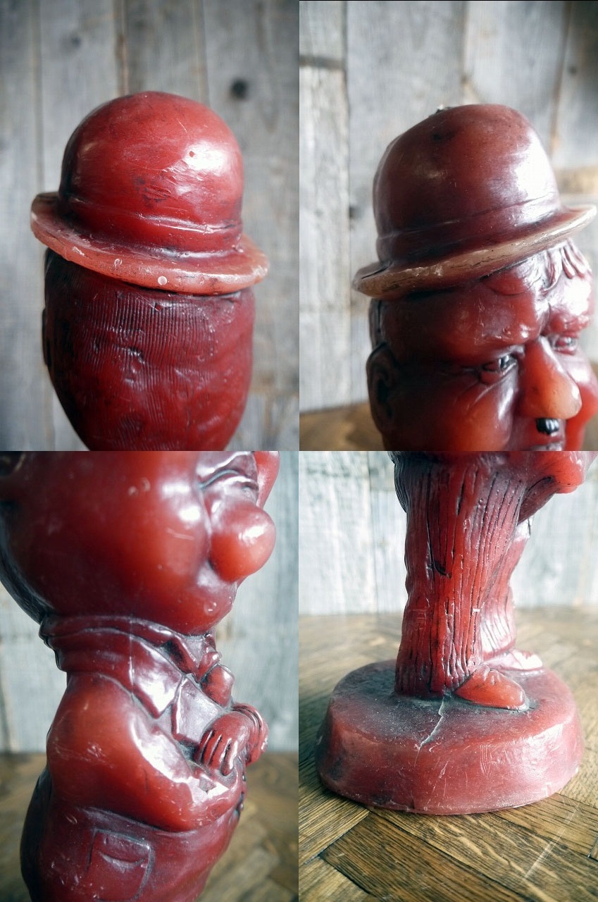 アメリカで買い付けましたビンテージのHardyキャンドル人形です。サイレントからトーキーの時代にかけて活躍したアメリカのお笑いコンビLaurel &HardyのHardyデザインのキャンドルで、コメディアンらしいチャーミングな顔の表情がとても可愛いらしいです。年代の表記はありませんがデザインから1970年代製にるかと思います。お部屋などのディスプレイとしてオススメです。キャンドルですので直射ニックの当たる場所や高温の場所ですと溶けるかと思いますのでご注意下さい。状態は未使用ですが、画像の様な傷、擦れ、汚れはありますが、ディスプレイには問題なく良いです。ただあくまでビンテージになりますのでご理解いただける方のご購入をお願いします。