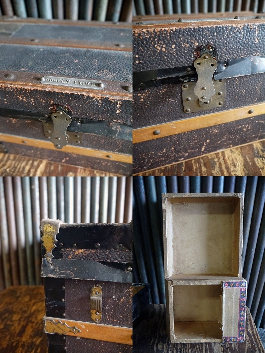 アメリカで買い付けてきましたアンティークのトランクケースです。渋い色褪せたカラーに長年使い込まれたリアルでシャビーな風合い&ネームロゴプレートデザインとても雰囲気があります。ウッド×レザー持ち手素材で、当時のセールスマンサンプルになります。ビンテージ、アンティークショップ等の店舗等のディスプレイとしてお使い下さい。年代の表記はございませんが、デザインから1900年代初頭から1920年前後頃のトランクケースになるかと思います。状態ですが多少の傷や擦れ、トランク部分に多少膨張(ウッドの多少の膨らみ)画像の様な傷、サビ汚れ、レザー持ち手の劣化ダメージ、鍵金具部分の壊れ、上蓋の歪み、塗装剥がれ、内側の汚れ&剥がれや細かい釘金具欠損、トランク特有の多少の臭いなどの使用感はありますがディスプレイには問題な雰囲気のある状態かと思います。あくまでアンティークジャンクですので理解のある方のご購入をお願いします。