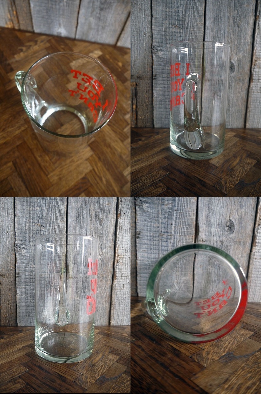 アメリカで買い付けましたビンテージのI BET YOU CANT ビールジョッキです。クリアガラスにアメリカンなロゴデザインがとても雰囲気があります。ガラス素材で持ち手部分の下側は本体には付いていないユニークばデザインになります。年代の表記はありませんがデザインから1960〜70年代前後頃かと思います。状態ですが多少の擦れはありますが、目立つダメージはなく、ディスプレイには問題の無い状態で良いです。ただあくまでビンテージですのでご理解いただける方の購入をよろしくお願いします。