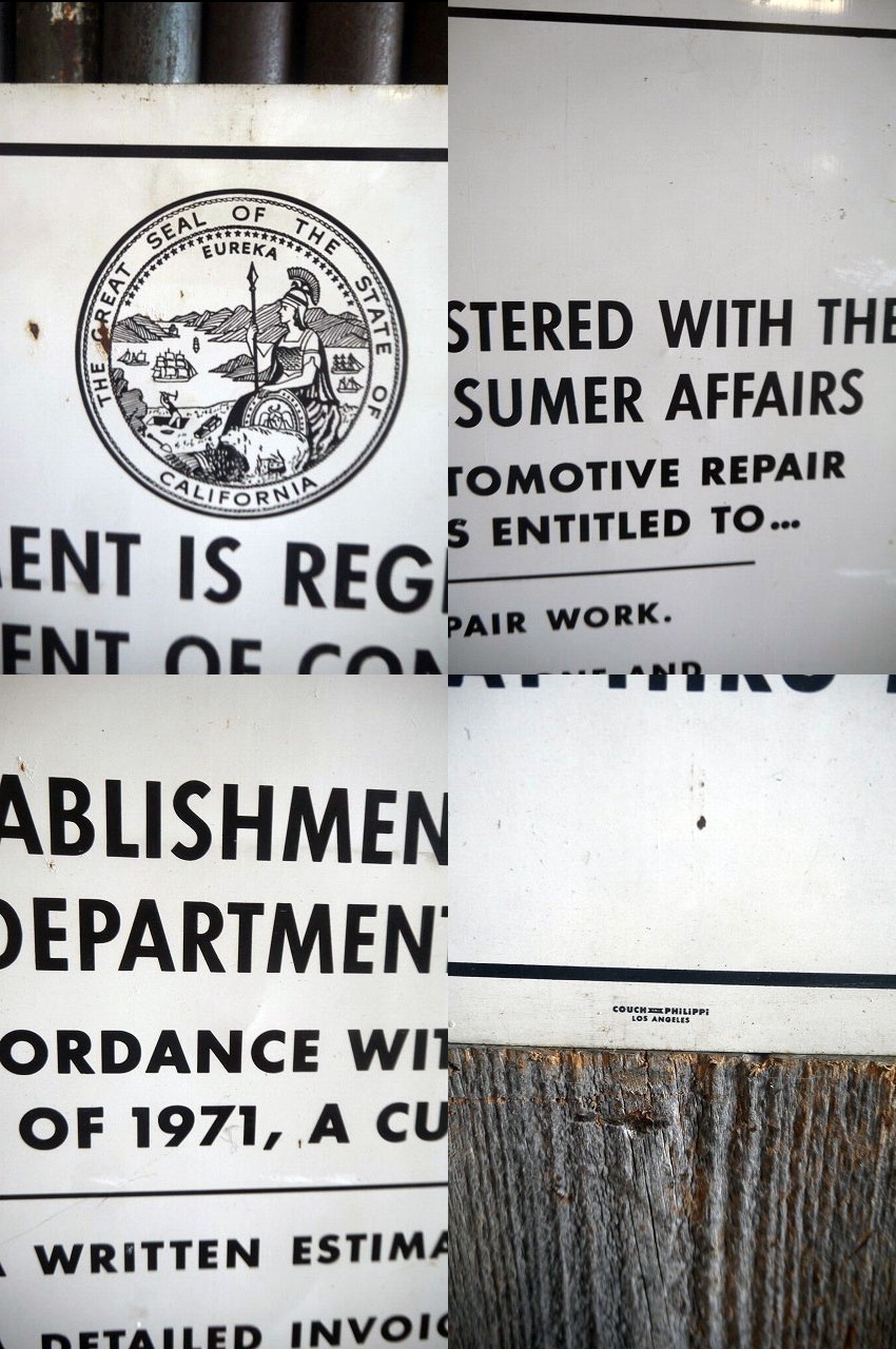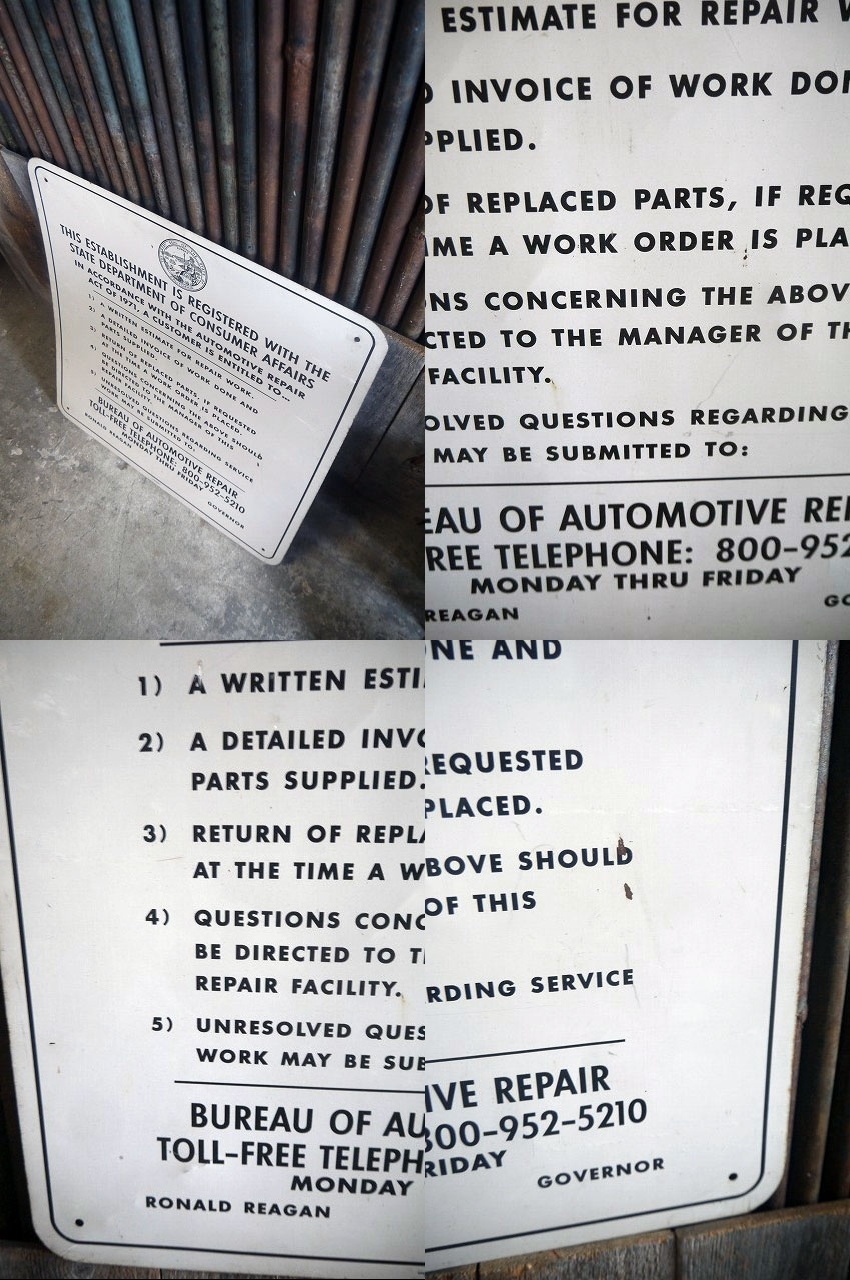 アメリカで買い付けましたビンテージのDCA看板になります。アメリカの企業等にて実際に使われていた看板で、ホワイトカラーににリアルなメタルの風合い&アメリカンなロゴデザインが抜群の雰囲気です。メタル素材のペンキ塗装で、1971RONALD REAGANの表記がありますので1970年代初期頃になります。アメリカのDCA(カリフォルニア州の消費者局)の珍しい看板になります。状態ですが画像の様に経年による使用感で多少の表面塗装剥がれ、傷、サビなどはありますがディスプレイには問題ないレベルで雰囲気のある状態で良いです。ただあくまでビンテージのためご理解いただける方のご購入をお願いします。